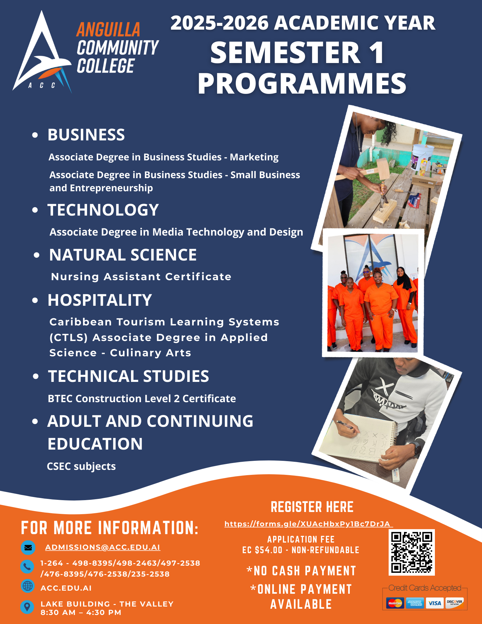 Anguilla Community College (ACC) is Anguilla’s first indigenous tertiary education institution. ACC is pioneering national human resource development at the tertiary education level, which is critical in developing a sustainable future for Anguilla.